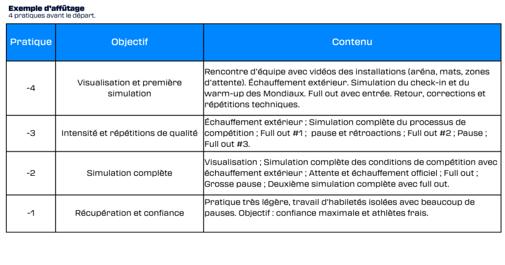Avec tous ces principes en tête, voici un exemple de plan de pratique pour les deux semaines précédant les Mondiaux. L’objectif est de reproduire les conditions de compétition tout en réduisant progressivement la fatigue des athlètes.